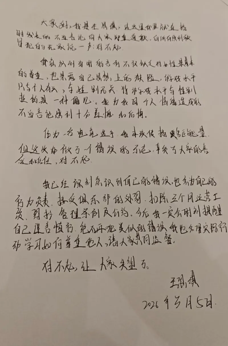 虎扑03月05日讯 小屿发文道歉:缺乏对女性最基本的尊重,扣除三个月工资